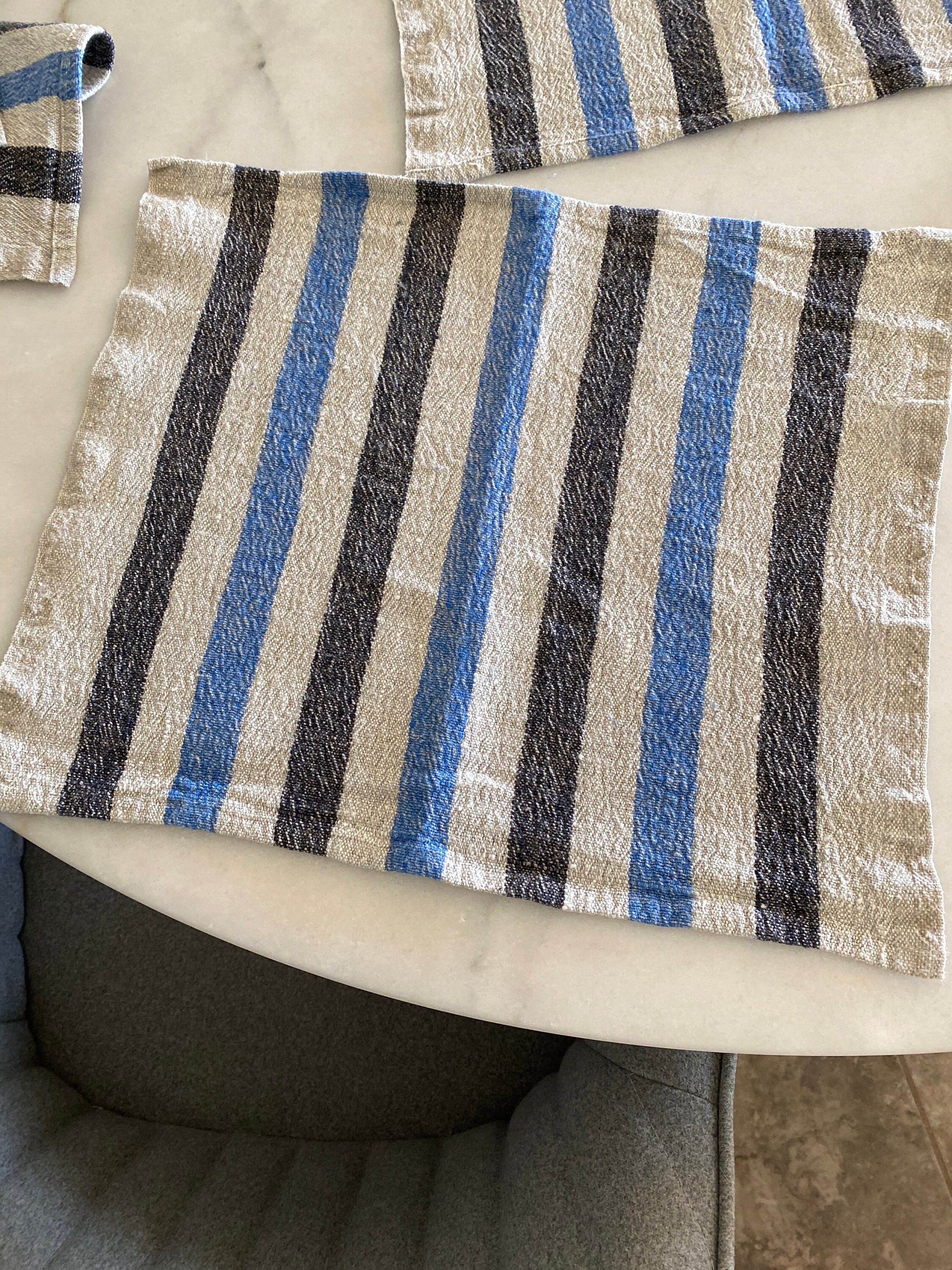 A set of natural linen placemats with blue and gray stripes. Hand-made from 100% pure high quality European linen. These placemats add an eco-friendly and rustic atmosphere for your dining table. Linen’s characteristics allows the placemats to be durable in the same time bringing stylish atmosphere to your home.