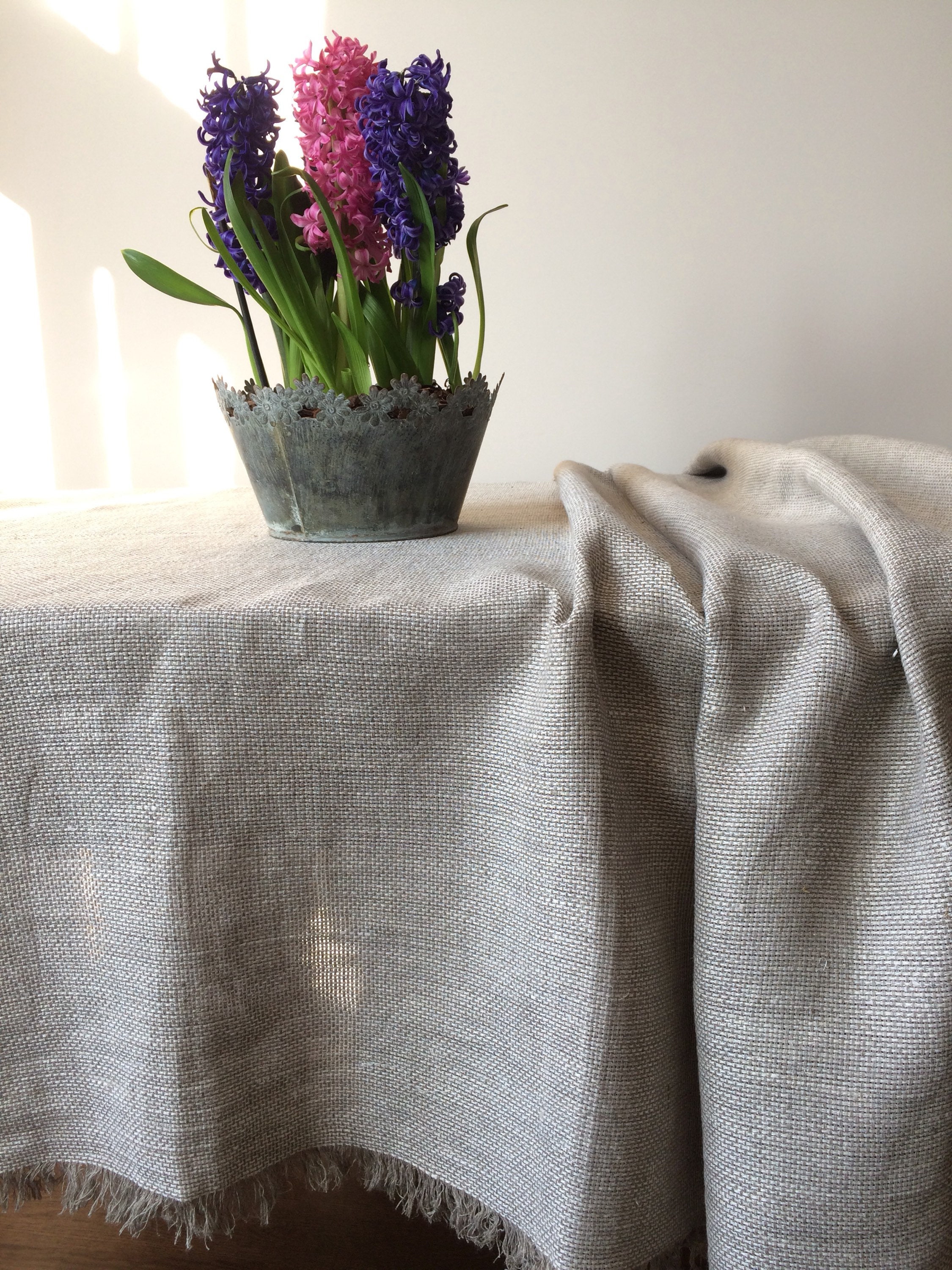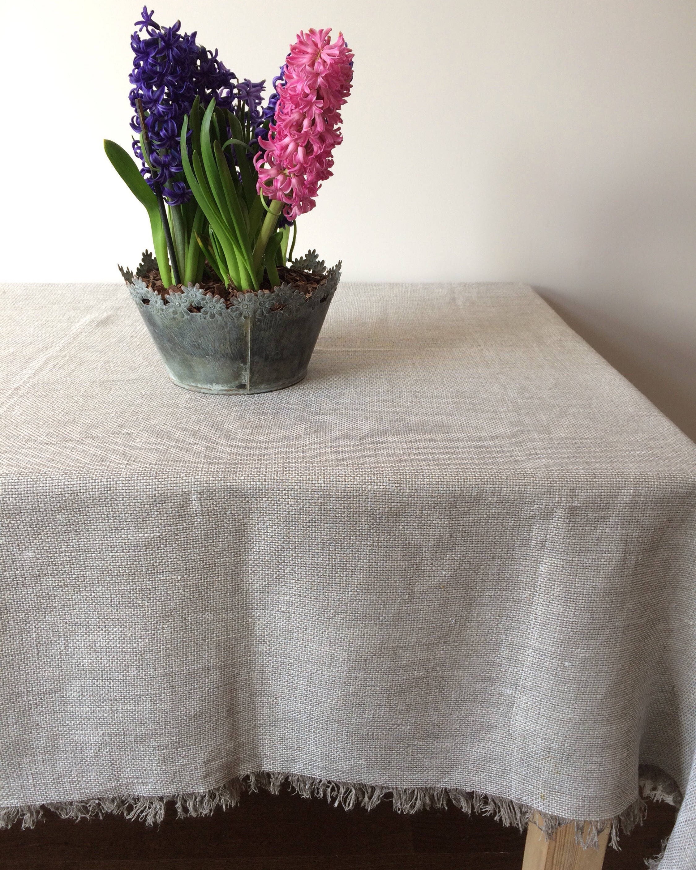 Natural linen tablecloth. The tablecloth is with fringed edges on all sides to ensure a modern and stylish atmosphere. Hand-made from 100% pure high quality European linen. The tablecloth will add light and cozy atmosphere to your home. In order to ensure that the tablecloth does not shrink, it has been pre-washed.