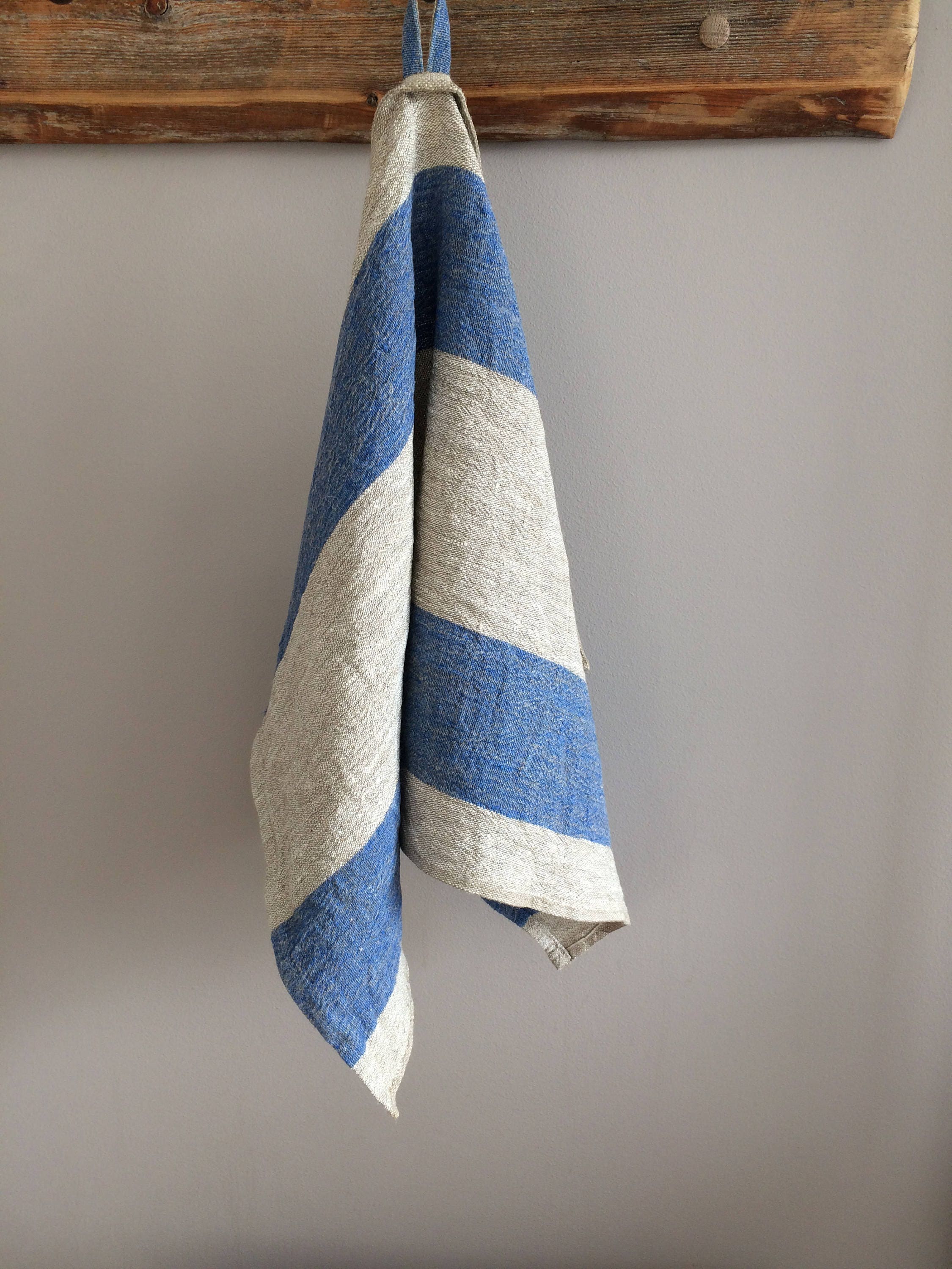 Kitchen towel made of natural linen with large blue stripes. Hand-made from 100% pure high quality European linen. This linen linen towel will bring a stylish and rustic atmosphere to your kitchen. Linen’s characteristics allows it to absorb moisture very well and to dry fast. The towel are durable in the same time providing pleasant feeling for your skin.