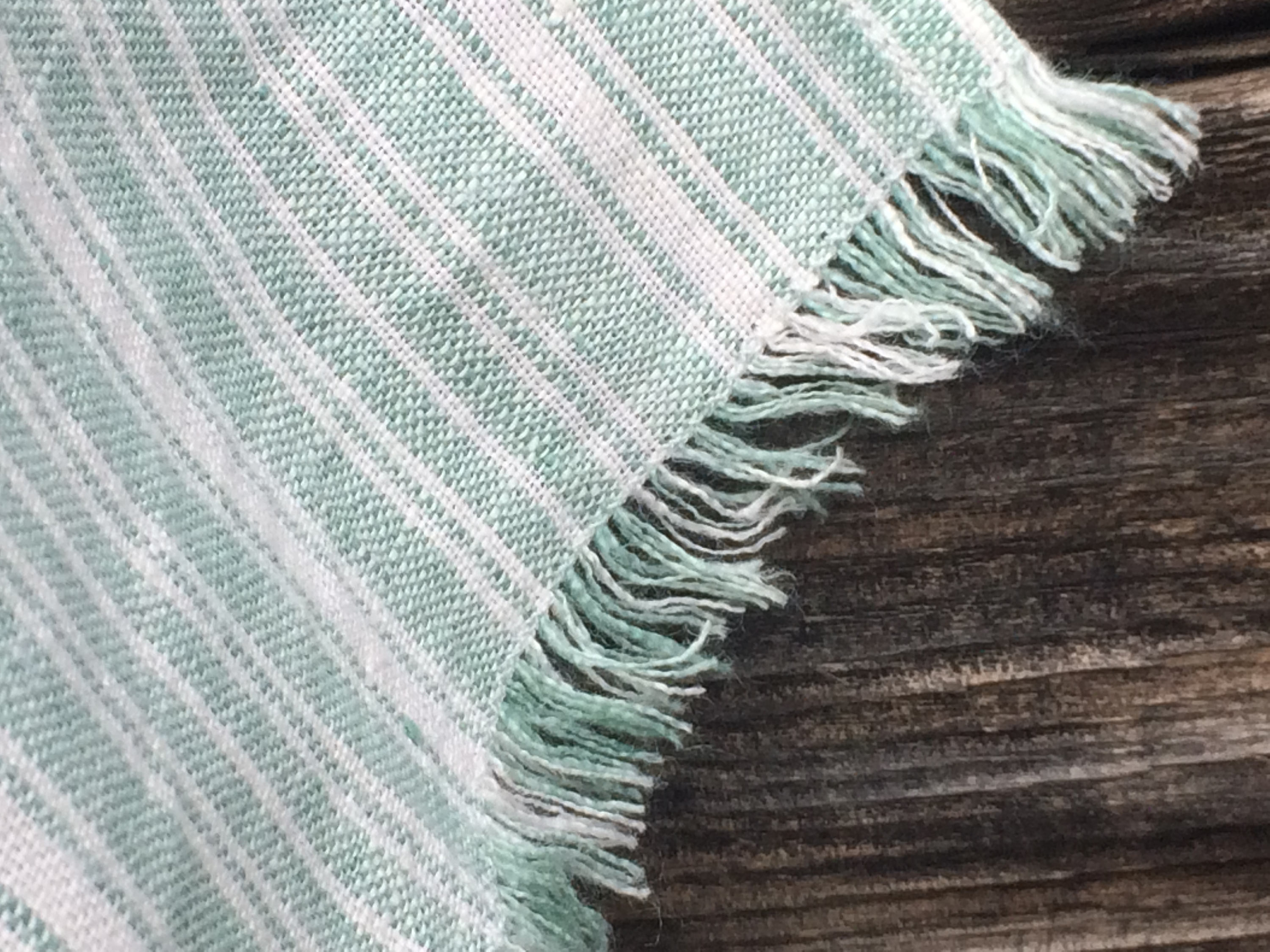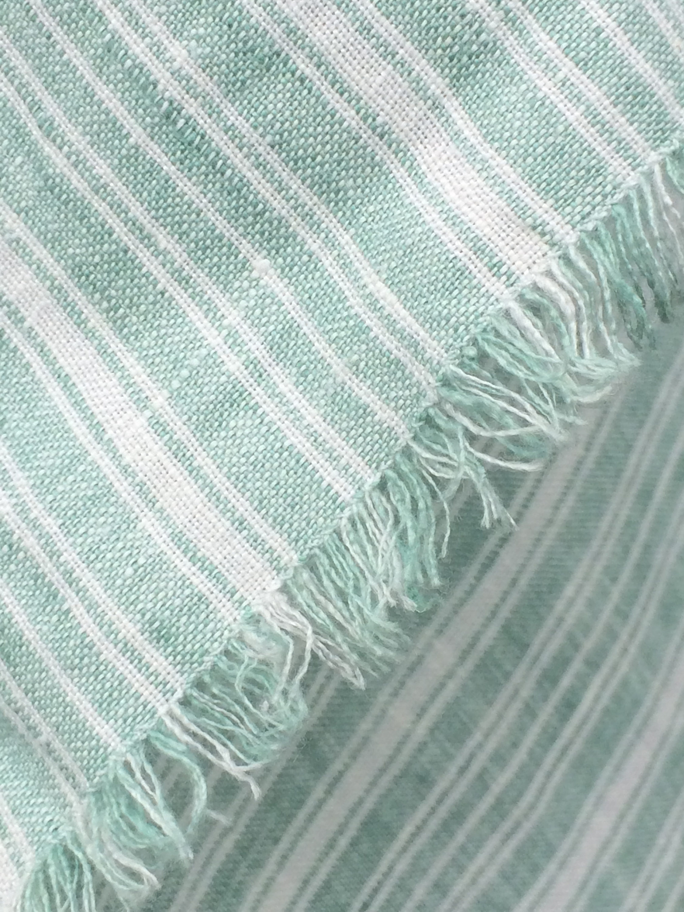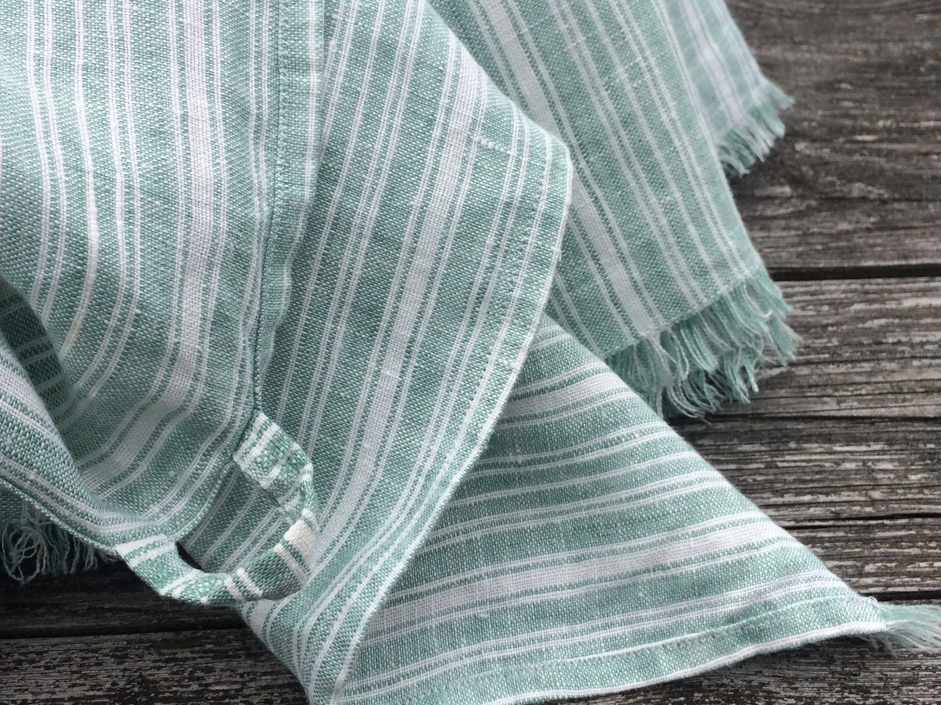 Linen towel with light green and white stripes. The towel is very soft and has beautiful fringes. Hand-made from 100% pure high quality European linen.