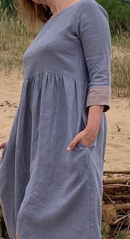 Linen dress with belt and two side pockets made from 2 colors - lavender as base color and dusty lavender for the belt and for the sleeve collars. Hand-made from 100% pure high quality European linen. This dress will let you feel very comfortable and stylish.
