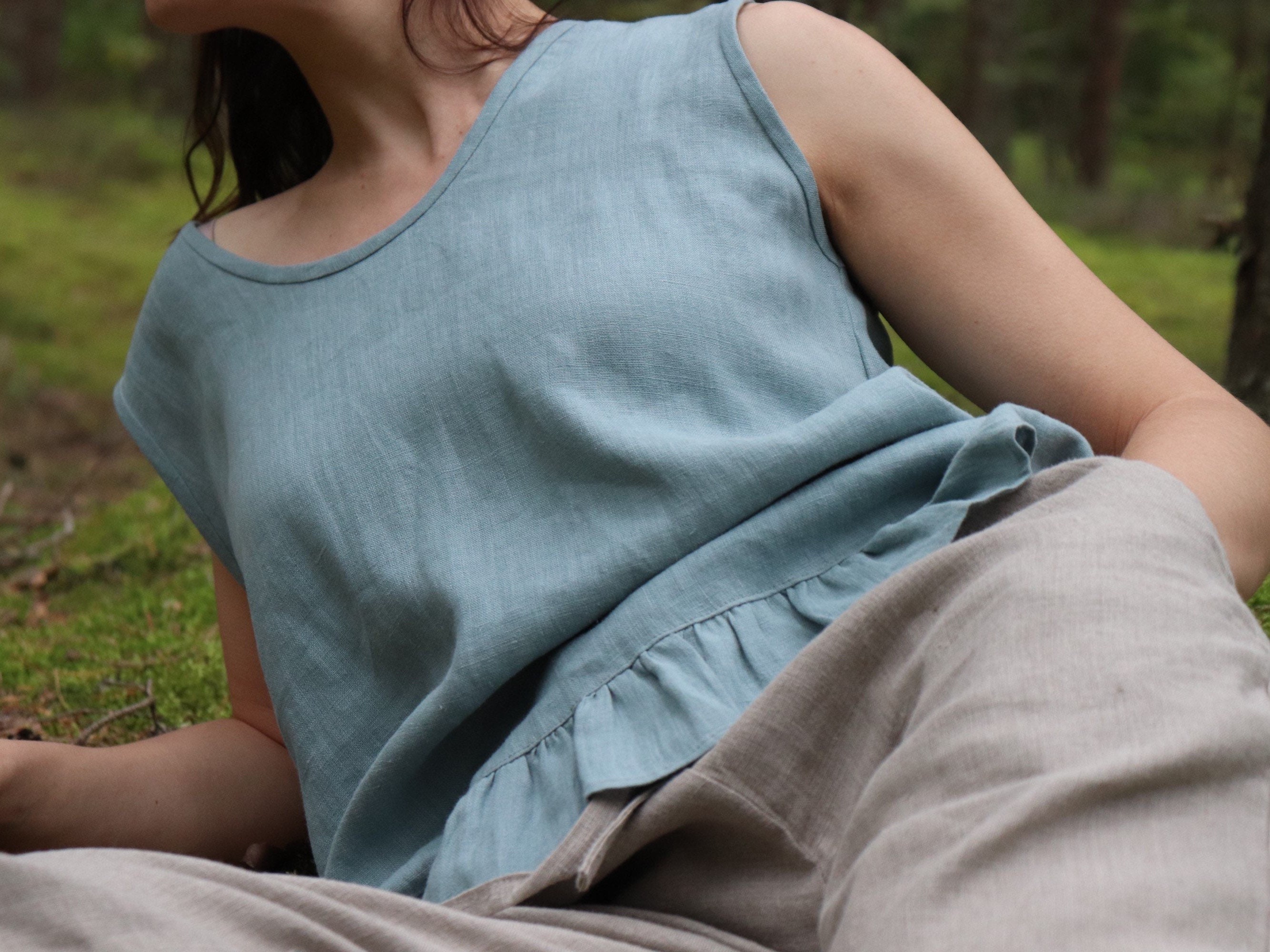 Linen shirt with frills and longer back. Perfect linen shirt for summer. Available in many colors. Hand-made from 100% pure high quality European linen. This linen shirt will let you feel very comfortable and stylish.